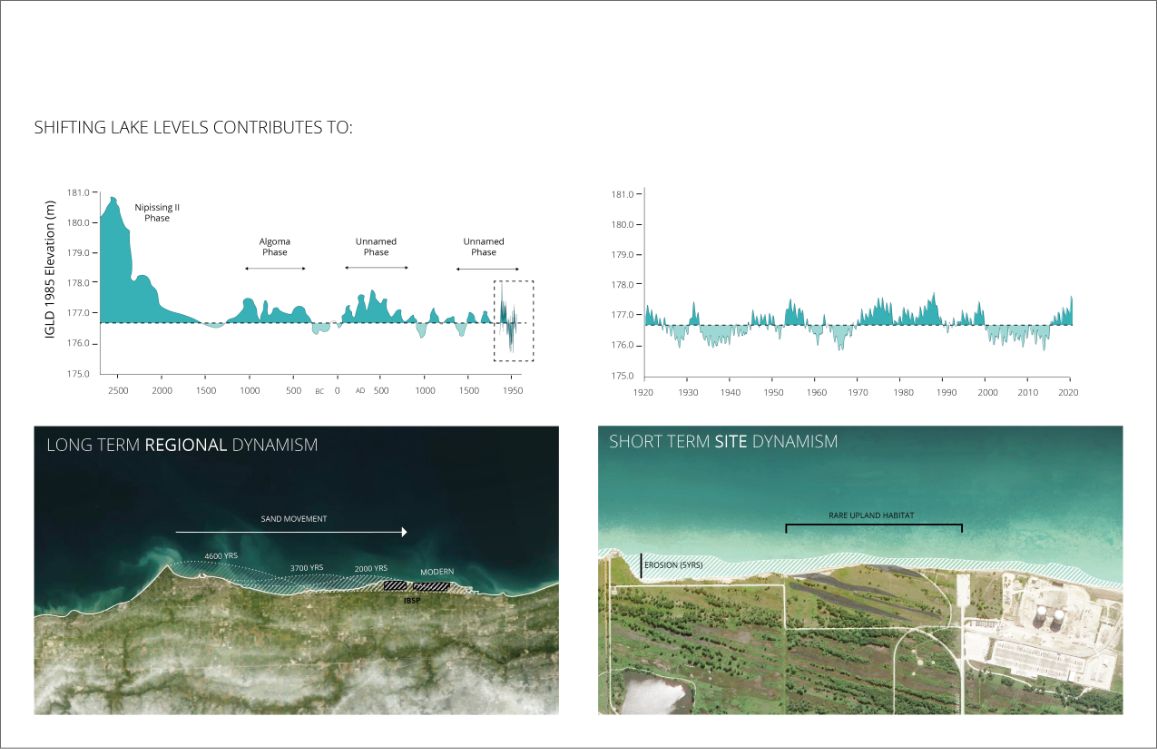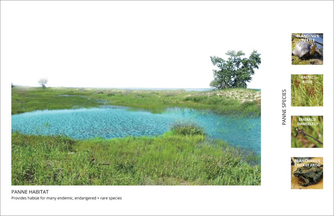 We were enlisted to develop an innovative, lower-cost, more rapid-response intervention to slow the immediate threat to important ecological areas from the rampant erosion caused by high lake levels. Erosion in the northern portion of the park and sediment deposit in the south built up the unique curvilinear ridge-and-swale topography which supports the upland black oak savannas and the lowland wetlands. However, we know recent shifts in weather patterns and various human influences have rapidly increased the erosional process of this region, erasing what took thousands of years to develop in less than half a century.