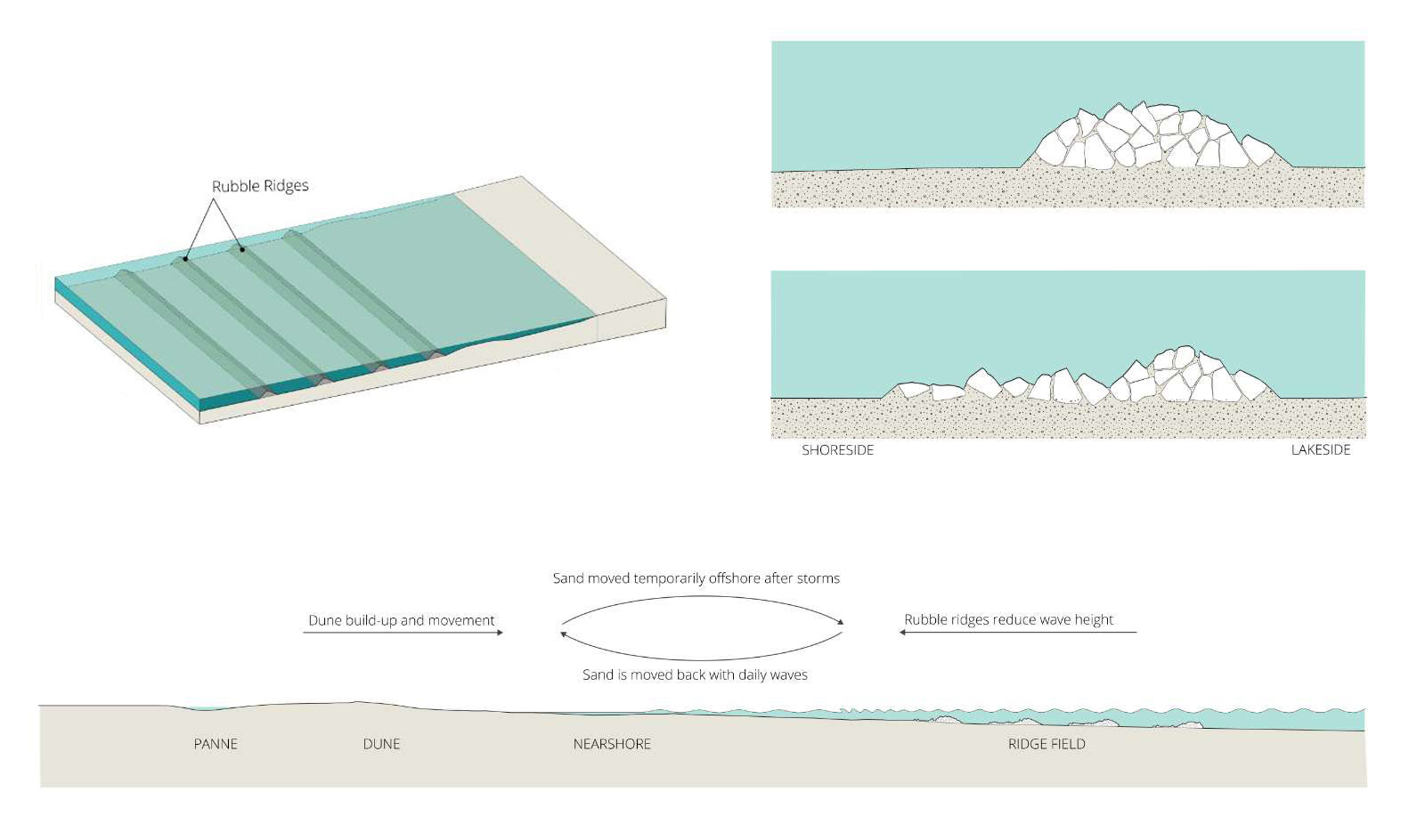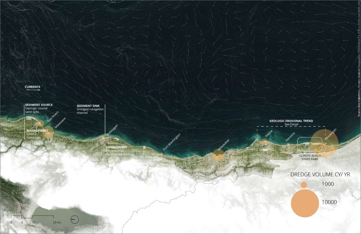 The intervention at Illinois Beach State Park consists of a submerged ridge reef, designed to slow sediment moment and protect the valuable terrestrial panne habitat from the erosive forces of waves