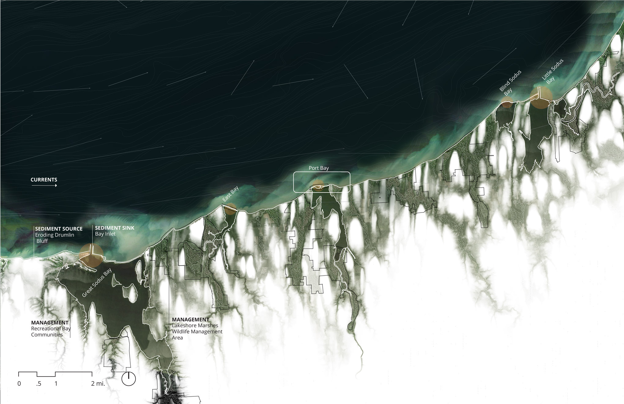 The intervention at Port Bay is the construction of a feeder bluff made from the annually dredged sediment. Analogous to what happens across the region, the bluff will erode through wave energy and transport material to the east, fortifying the weakened barrier bar