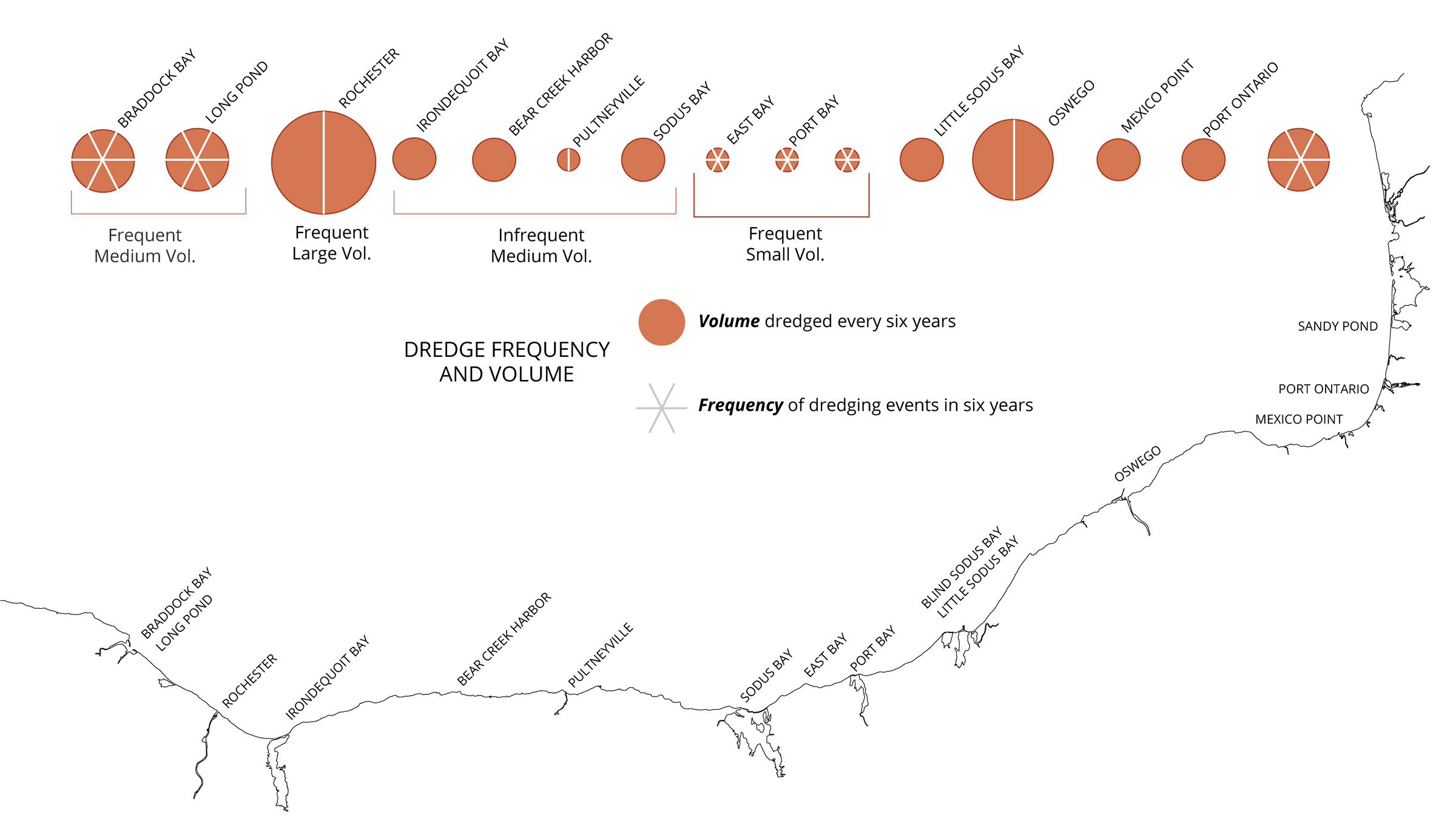 On the southern shore of Lake Ontario, Port Bay, NY is an active residential community with recreation opportunities like boating and fishing, including ice-fishing for northern pike and yellow perch when safe ice forms. Working closely with New York Department of Environmental Conservation (DEC) and Port Bay Improvement Association (PBIA), Healthy Port Futures aided in the design, implementation, and monitoring of a passive dredge management pilot project to create a bell-shaped sediment pile known as the Cobble Bell that feeds the eroded nearshore.